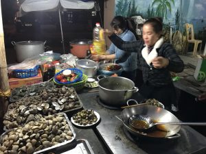 I was in bed pretty much all day, but in the evening we walked down the beach a bit to where the fishing boats were and meandered around looking for some place to eat – eventually, we found a street-side location where we had clams, sea snails and shrimps (and nothing else) – very tasty, but not enough – we had a plate of fried rice at the hotel restaurant then on the way back.
