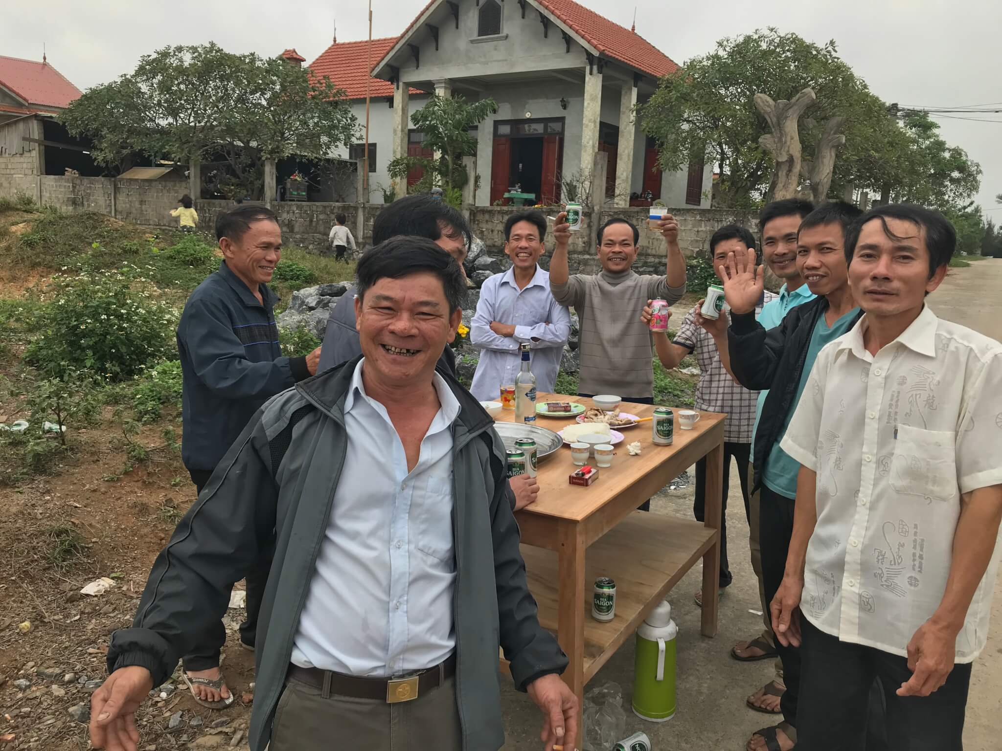 It was an interesting cycle, lots of potholes, and washouts, and it certainly was entertaining with great views of the beach regularly, but we didn’t make to much progress, so we decided to head inland a bit on to a parallel highway to the HCM-Highway 1. On the way, we stumbled across a party of fairly drunk gentlemen, who insisted we drink some beer with them – quite amusing – they no doubt had good reason to celebrate so early in the morning. We suspect that it was some wedding pre-event. We ran across a number of village weddings today.