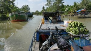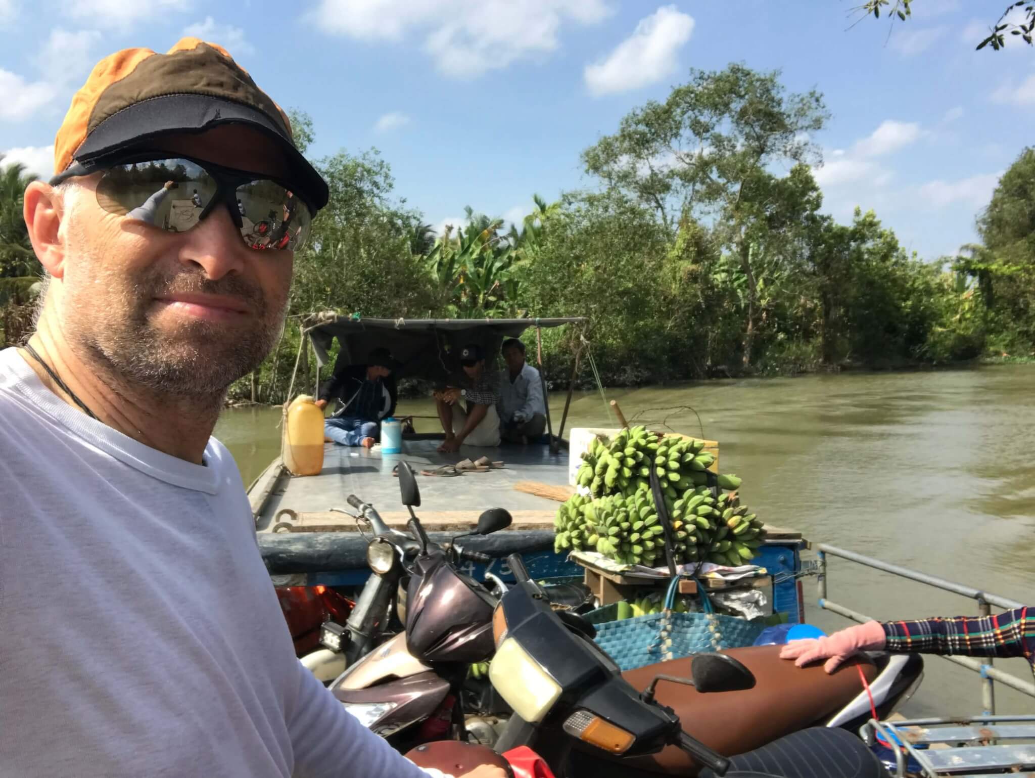 So, we started the day with a small local ferry across the Mekong (which we probably would never have known about or found if the owner of the bungalows hadn’t told us about it) – for less than 1€ two bikes and two persons.