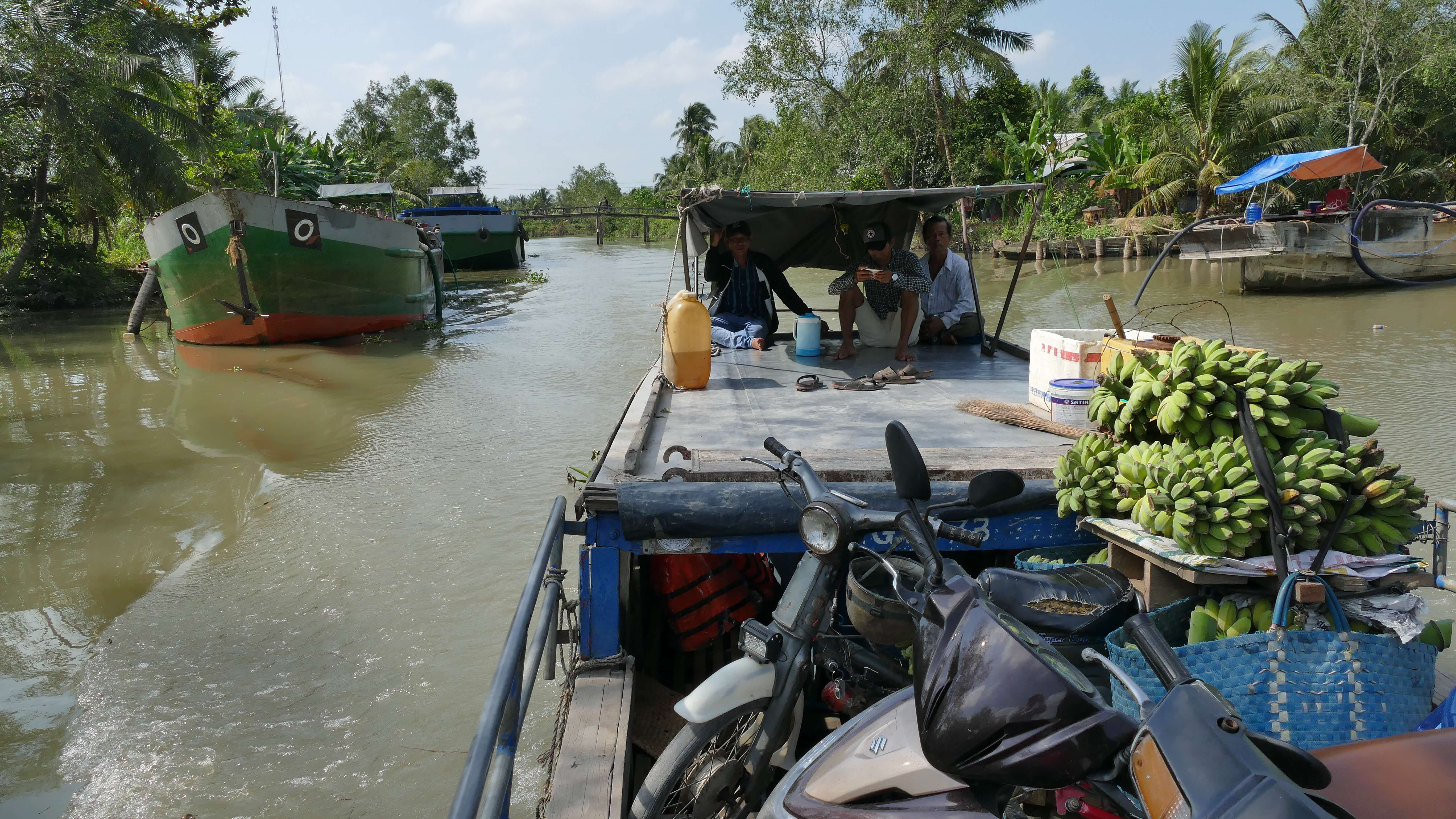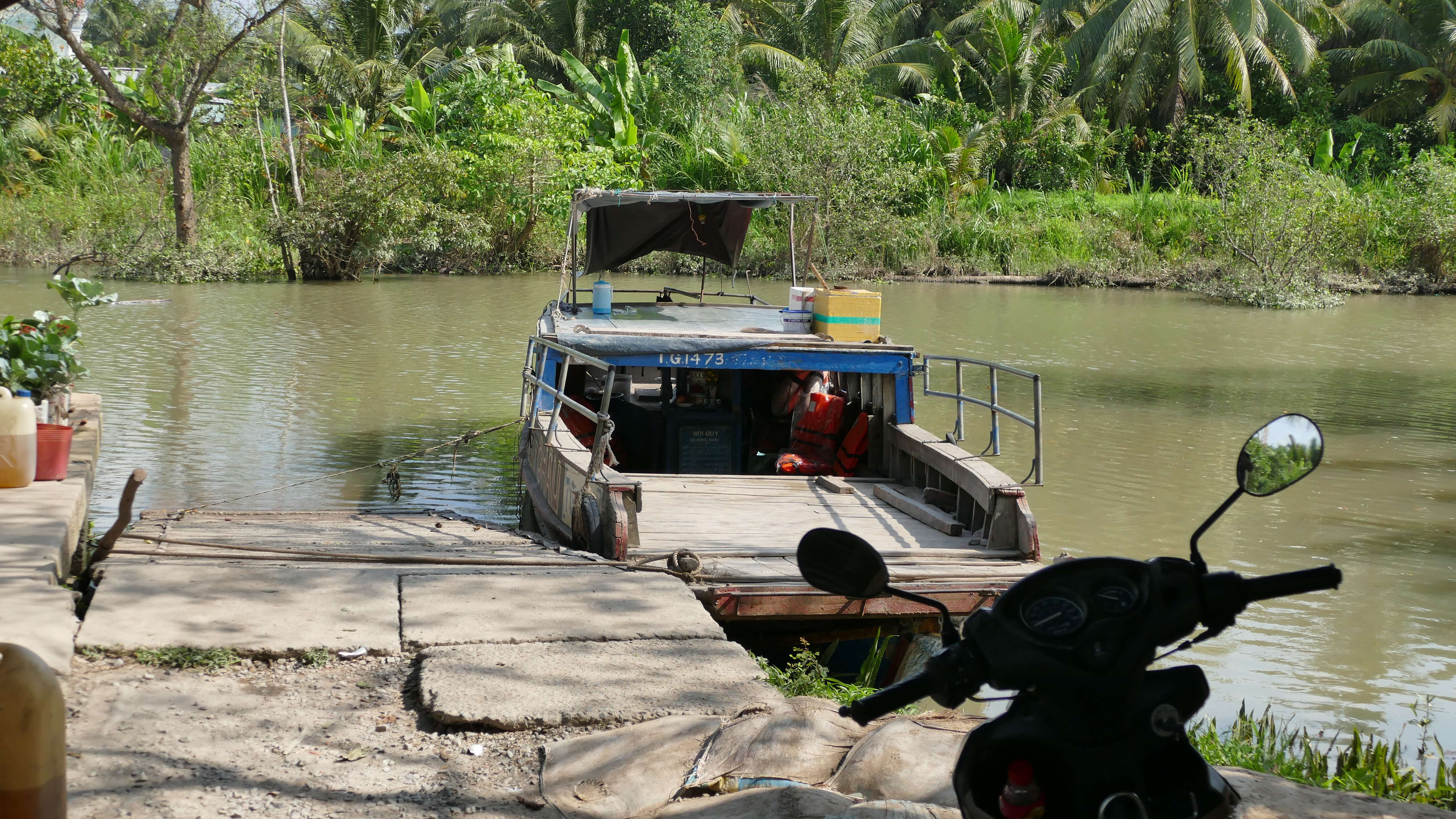 We wanted to get on the north side of the Mekong again, without having to backtrack and cross the bridge (about 15km back and 100m vertical – a BIG bridge) as we wanted to visit the Ca Be floating market on our way to Sa Dec.