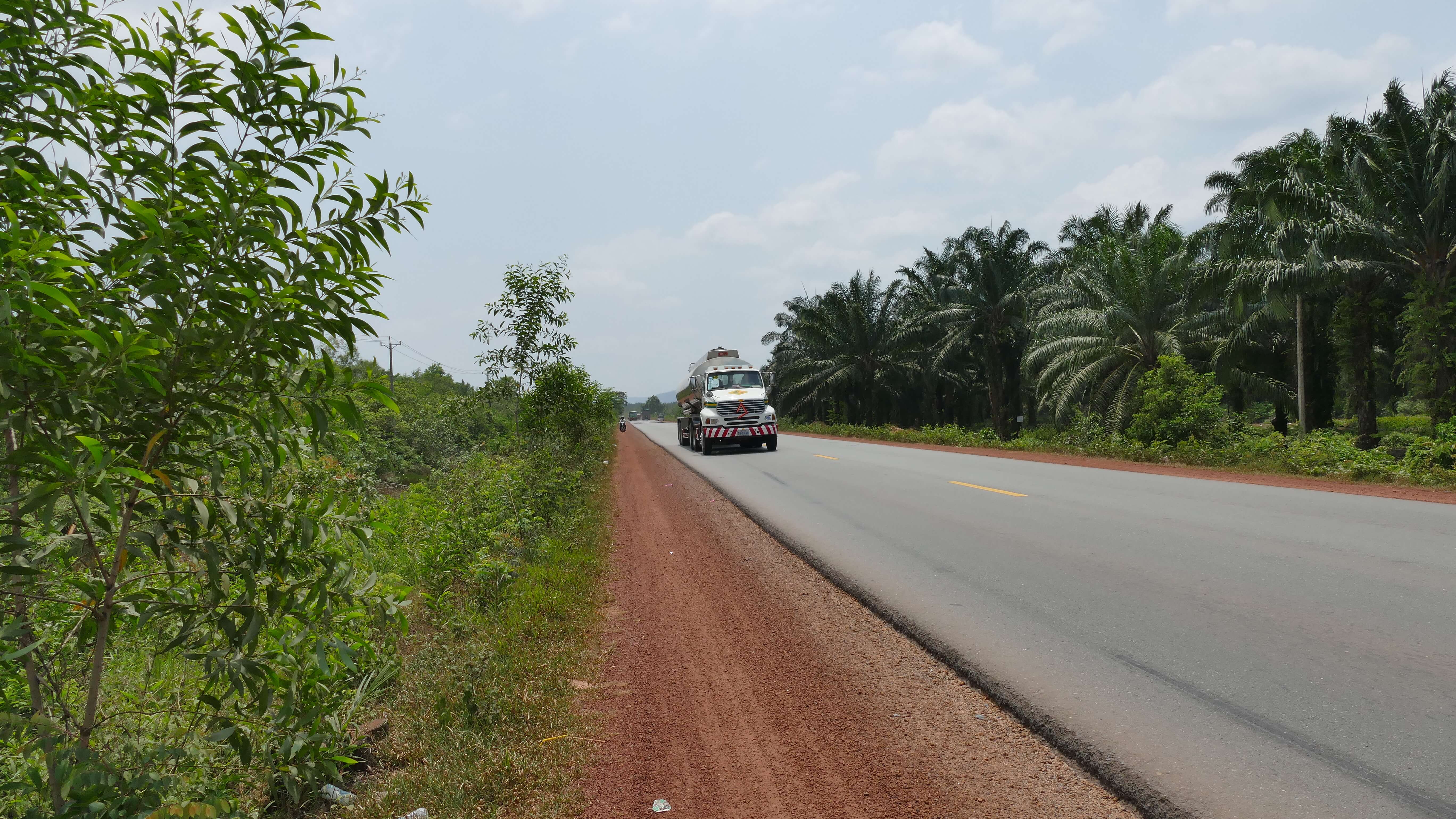 The road was just highway all the way today – busy with trucks and buses. The highway had one lane in each direction and quite a wide shoulder (but the shoulder was dirt/gravel and not very suitable for cycling) with a drop-off of about 10-15cm between the road and the shoulder. We cycled as much as we could on the road, but were forced off several times (mostly by vehicles passing in the other direction using up the whole width of our side of the road). Sometimes the trucks came very close, to the point where we were forced onto the shoulder.